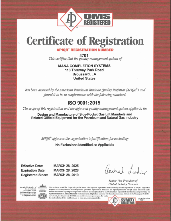 MANA Completion Systems is an ISO 9001:2015 certified company. ISO 9001:2015 specifies the requirements for a Quality Management System. Through the strict requirements of ISO 9001:2015, MANA Completion Systems is able to demonstrate its ability to consistently provide quality products that meet customer and regulatory requirements. Certification to ISO 9001:2015 also aims to enhance customer satisfaction through effective implementation of a Quality Management System.