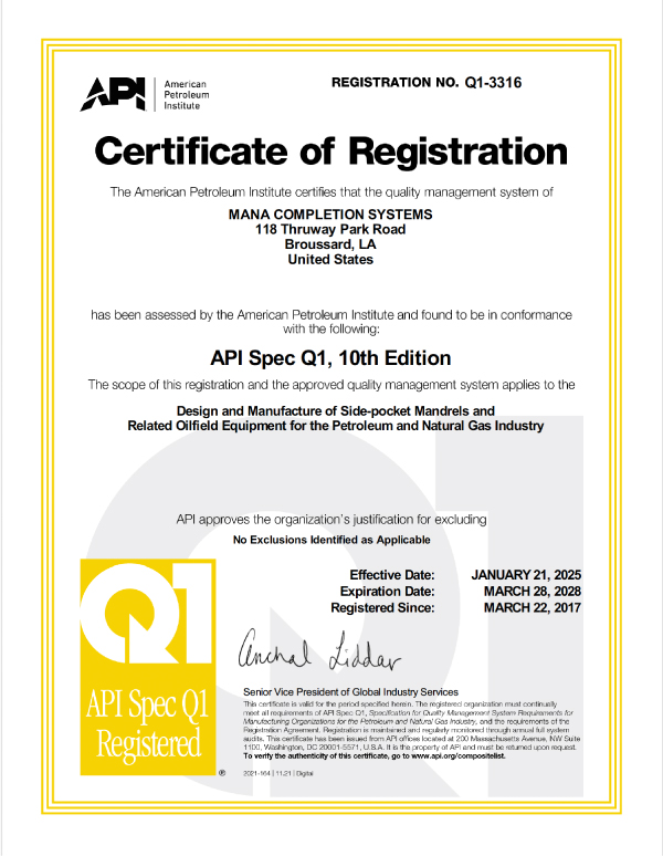 MANA Completion Systems is an API Specification Q1 certified company. API Specification Q1 is the industry standard for Quality Management System requirements for manufacturing organizations in the petroleum and natural gas industry. Through the strict requirements of API Specification Q1, MANA Completion Systems ensures that a Quality Management System is in place to assure the quality, traceability and workmanship of all products throughout the production process.